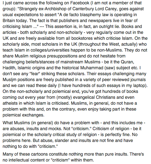 Does a ‘de facto blasphemy law’ operate in Britain today? By paulwilliamsbloggingtheologycom on January 18, 2015 • ( 0 ) A sensible analysis from a Facebook friend: Share this:Share Click to share on Facebook (Opens in new window) Facebook Click to email a link to a friend (Opens in new window) Email Click to share on WhatsApp (Opens in new window) WhatsApp Click to share on Tumblr (Opens in new window) Tumblr Click to share on X (Opens in new window) X Like Loading...‹ An Unhelpful Commentary To The “British Islam” Panorama DocumentaryRules for freedom of speech ›Categories: Islam