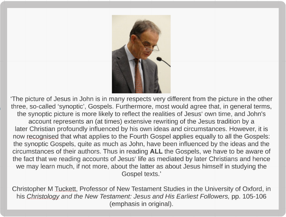The Revd Christopher Tuckett is a British biblical scholar and Anglican priest. He is Professor of New Testament Studies at the University of Oxford and a Fellow of Pembroke College. His analysis (below) is widely shared by other NT scholars. If accurate, it means we cannot simply read the gospels as if they tell us what the *historical Jesus* actually said and did. We are reading (to a greater or lesser degree) the interpretations and opinions about Jesus of later unknown Christian writers. The gospels are anonymous works whose authorship is unknown.
