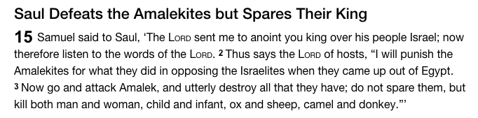 Anyway in terms of the Amalekites in 1 Samuel 15, the reason behind the sanction by God is historical. 1 Samuel 15:2 “This is what the LORD Almighty says: ‘I will punish the Amalekites for what they did to Israel when they waylaid them as they came up from Egypt.”