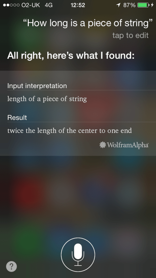 I asked Siri – how long is a piece of string? By paulwilliamsbloggingtheologycom on August 29, 2015 • ( 0 ) a perfect answer: Share this:Share Click to share on Facebook (Opens in new window) Facebook Click to email a link to a friend (Opens in new window) Email Click to share on WhatsApp (Opens in new window) WhatsApp Click to share on Tumblr (Opens in new window) Tumblr Click to share on X (Opens in new window) X Like Loading...‹ Visit Palestine.Islam’s stance on Music ›Categories: Islam