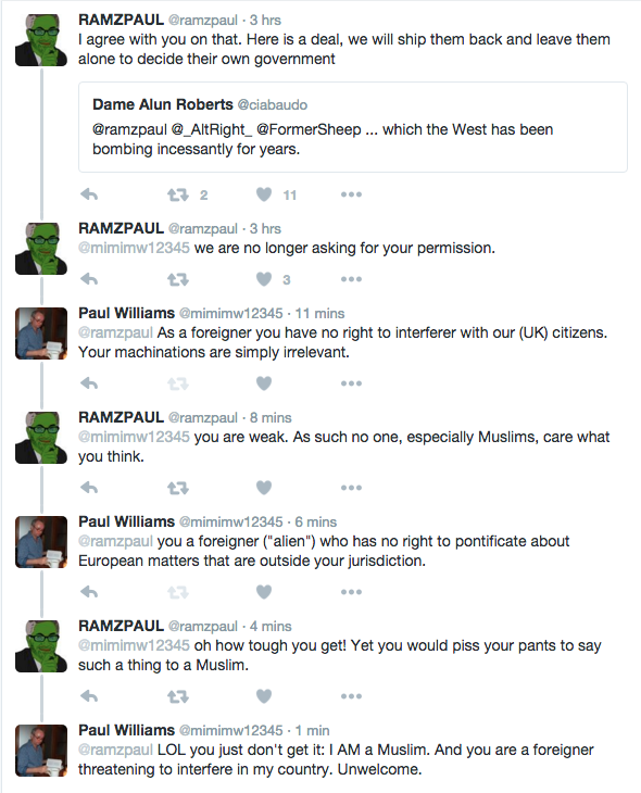 RamZPaul is an American video blogger and humorist who has gained notoriety for his YouTube videos, which consist of wry monologues on contemporary politics and society from a white nationalist perspective. He is a leading propagandist for the alt-right. Over the past 24 hrs he has called for all Muslims to leave Europe and go back to our own countries (!) As you can see I criticise him – a foreigner – for interfering in the internal affairs of other countries’ citizens. Why do Americans think they have a right to push other people around?