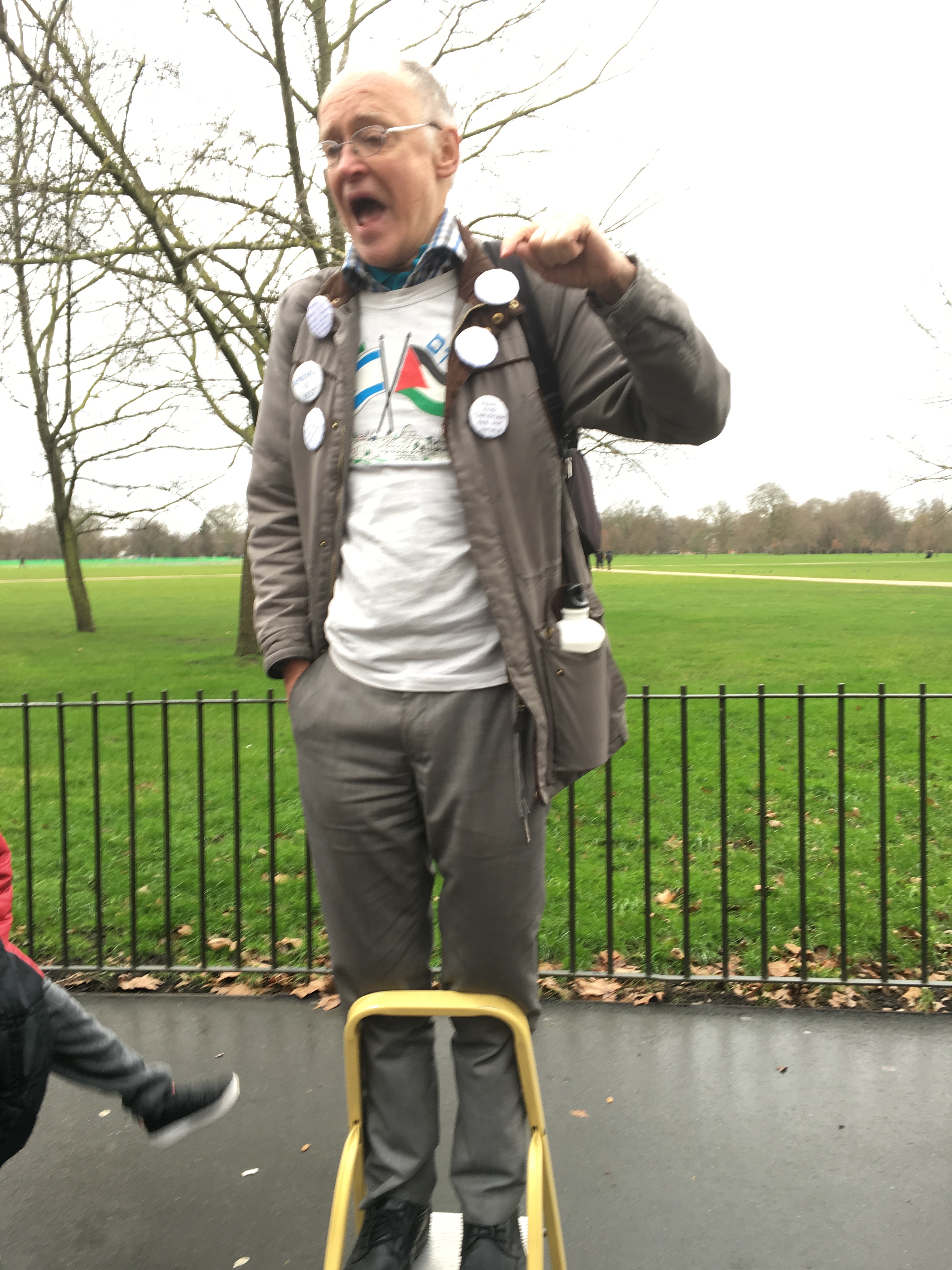 A brave man: he zealously defends Zionism and the entity known as ‘Israel’ in front of the many Arabs present at Speakers Corner. He is always unmolested.