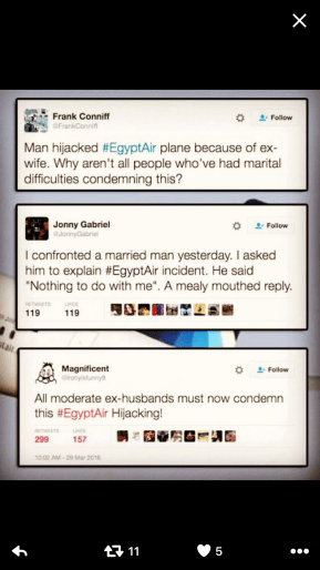 If even they condemn it, we will not be satisfied and still blame all of them(married men) as terrorists because one of them hijacked a plane.