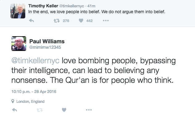 • So Allan would you say that the use of emotional arguments to try an convert people to Christianity are ineffective? This seems to be at the heart of Christian apologetics. Tim Keller eventhough he is certainly no intellectual slouch still cannot avoid the temptation to ‘love bomb’ people.