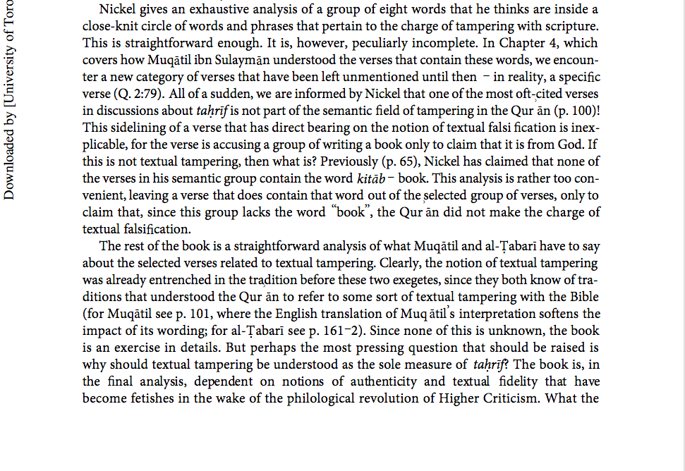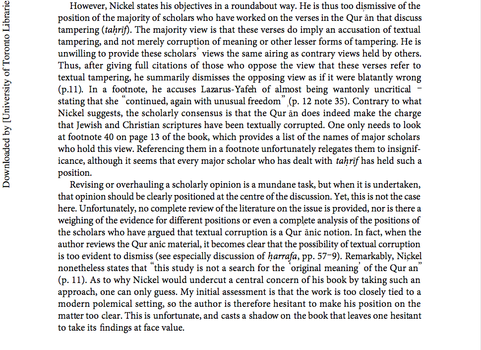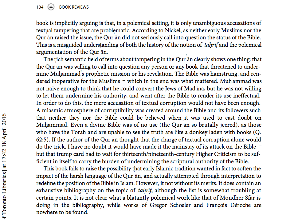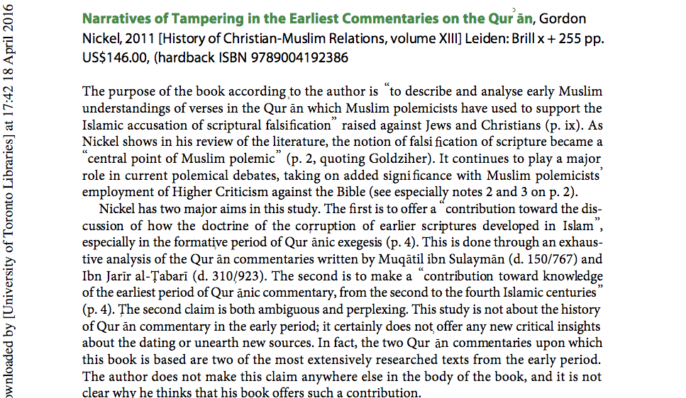 Dr Walid Saleh specialises in the Qur’an, its history, redaction and manuscripts; the history of the reception of the Qur’an and its exegesis, at the University of Toronto, Canada. His book review below contains some startling revelations (to me anyway). For example: “the scholarly consensus is that the Qurān does indeed make the charge that Jewish and Christian scriptures have been textually corrupted.” Click on the screen prints below for greater viewing clarity.