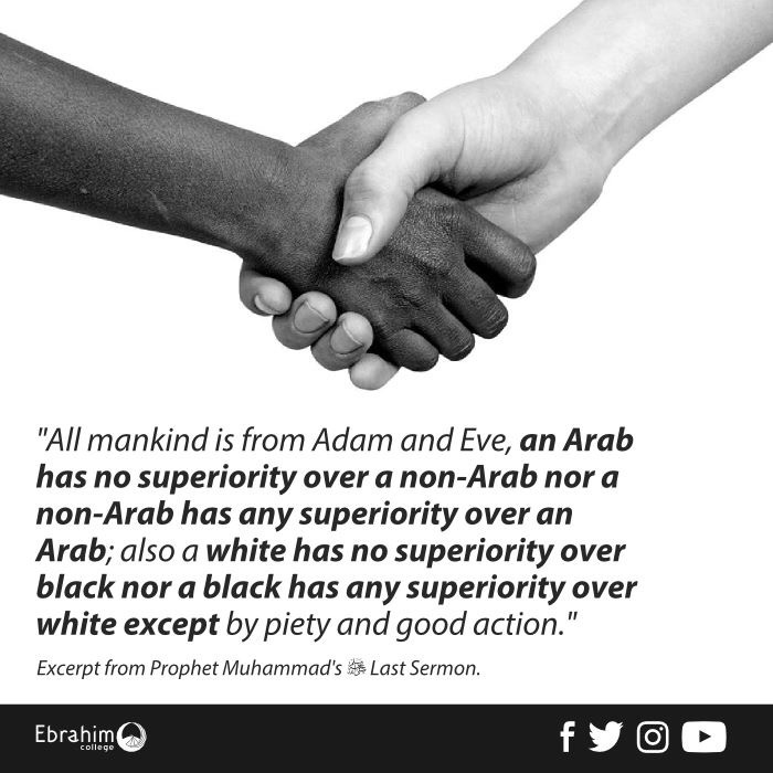 “The prophet, peace be upon him, said: “All mankind is from Adam and Eve, AN ARAB HAS NO SUPERIORITY OVER A NON-ARAB NOR A NON-ARAB HAS ANY “SUPERIORITY OVER AN ARAB; ALSO A WHITE HAS NO SUPERIORITY OVER A BLACK NOR A BLACK HAS ANY SUPERIORITY OVER WHITE EXCEPT BY PIETY AND GOOD ACTION. Learn that every Muslim is a brother to every Muslim and that the Muslims constitute one brotherhood. Nothing shall be legitimate to a Muslim which belongs to a fellow Muslim unless it was given freely and willingly. Do not, therefore, do injustice to yourselves.”