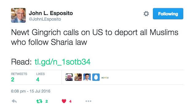 It just gets better and better.. By paulwilliamsbloggingtheologycom on July 15, 2016 • ( 0 ) http://www.ibtimes.co.uk/newt-gingrich-calls-us-deport-all-muslims-who-follow-sharia-law-1570747?utm_source=yahoo&utm_medium=referral&utm_campaign=rss&utm_content=/rss/yahoous/news&yptr=yahoo Share this:Share Click to share on Facebook (Opens in new window) Facebook Click to email a link to a friend (Opens in new window) Email Click to share on WhatsApp (Opens in new window) WhatsApp Click to share on Tumblr (Opens in new window) Tumblr Click to share on X (Opens in new window) X Like Loading...‹ #IBelieveInShariahDr James White Gets Schooled By Steven L Anderson – King James Bible Only ›Categories: Islamophobia, Life in the West, Silly, Utterly idiotic