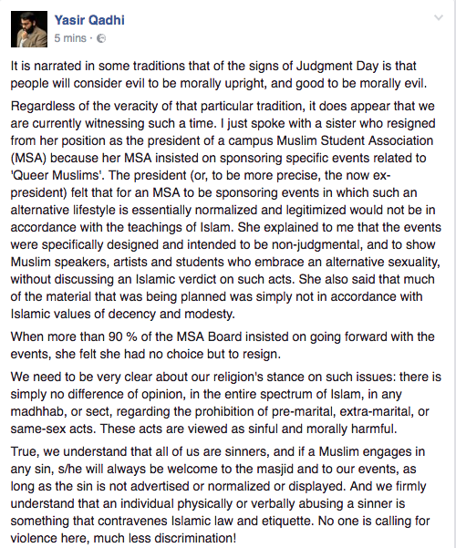 3. I commend the sister for taking a stand for her principles, regardless of it being right/wrong…it was sincere in its intent. But…Muslims do not live in a vacuum. In Islam, one keeps some things private—and sexual orientation would be one such thing—In the West it is a public identity. The counter-narrative that Islam should be promoting should be that some things are beyond human judgement—because they are a private matter between the individual and God and should not be a public matter. In other words—to discriminate between Queer and non-Queer (?) was unjust. The event should not have had ANY categories of sexual misconduct as a criteria at all. This should have been the principle we take a stand on with regards to the event. However, prejudice and discrimination can occur because people do not understand/have contact with—the other. An after-conference could have been organized where specific problems of injustice/prejudice/discrimination could have been discussed so that we can build better, more supportive communities of compassion and forgiveness for our brothers and sisters who have failings/inadequacies but are nevertheless sincere Muslims. Such a stance would not compromise either justice or moral principles….?….