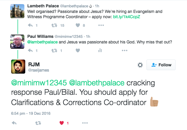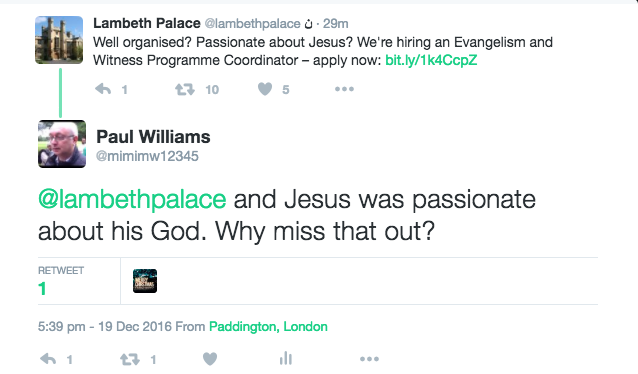 “Paul sent an unsolicited tweet” – Lambeth Palace invited replies to their tweet. Look again..