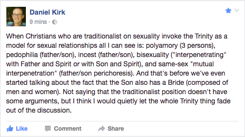 I’ve never heard a Trinitarian make that argument on sexuality. The ones who are invoking the Trinity idea like that are setting themselves up for ridicule.