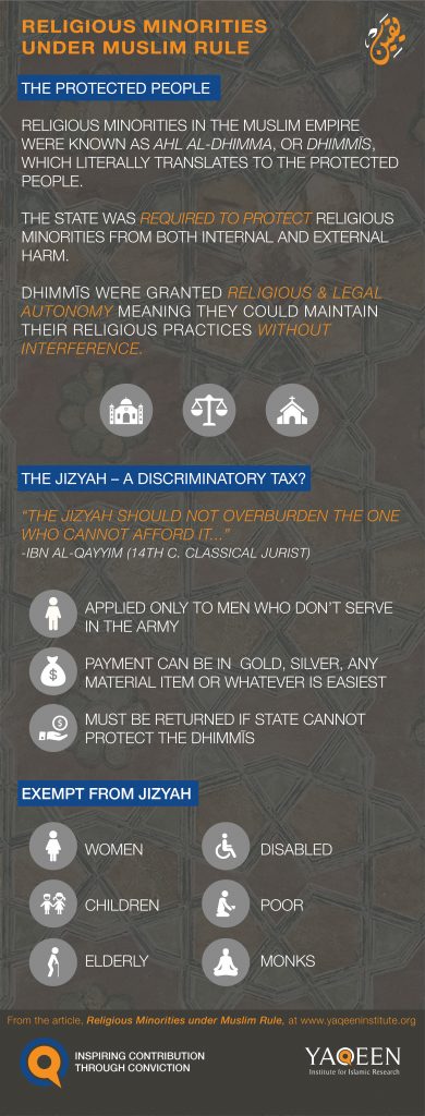 Religious minorities are often depicted as oppressed and vulnerable victims of their Muslim rulers. This portrayal, however, is far from accurate. This brief paper seeks to reorient our understanding of the rights and responsibilities religious minorities possessed under Muslim rule.