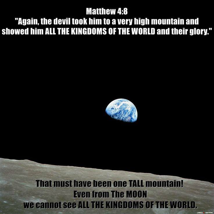 “If it was not flat what was the point of the devil taking Jesus up a very high mountain to show him all the kingdoms of earth? You cannot see them. See the pic taken from the moon.”