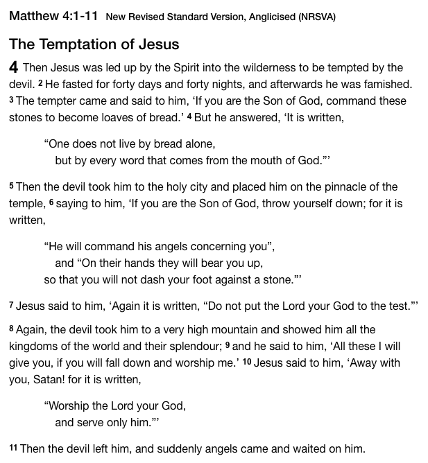 “Jesus is also saying that he will not worship the Devil, for he will only worship God alone, the ONE that created, sent, and empowered him, saying it is written, “Worship the Lord your God, and serve only him.””