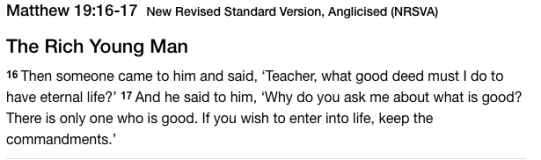 17 “Why do you ask me about what is good?” Jesus replied. “There is only One who is good. If you want to enter life, keep the commandments.”