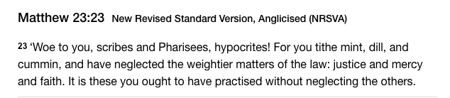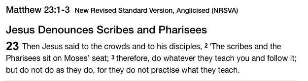 The scribes and Pharisees have a wrong-headed interpretation of the Law. They neglect important parts of the Law given to Moses. They should obey all of it: