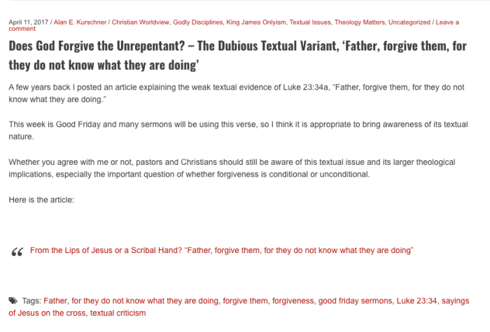 The often quoted saying of Jesus from the cross “Father, forgive them, for they do not know what they are doing” is described, rightly, as a ‘Dubious Textual Variant’. The article says this problem will have ‘theological implications’ for pastors and other Christians. It certainly will! All the Bibles we have include this dubious verse. Also, the article questions God’s unconditional forgiveness.