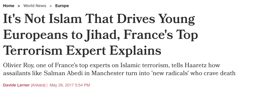 “It’s the Islamification of radicalism that we need to investigate, not the radicalization of Islam,” Roy says, begging the question of why radical youths would choose violent fundamentalist Islam over other destructive creeds to engage in terrorism.