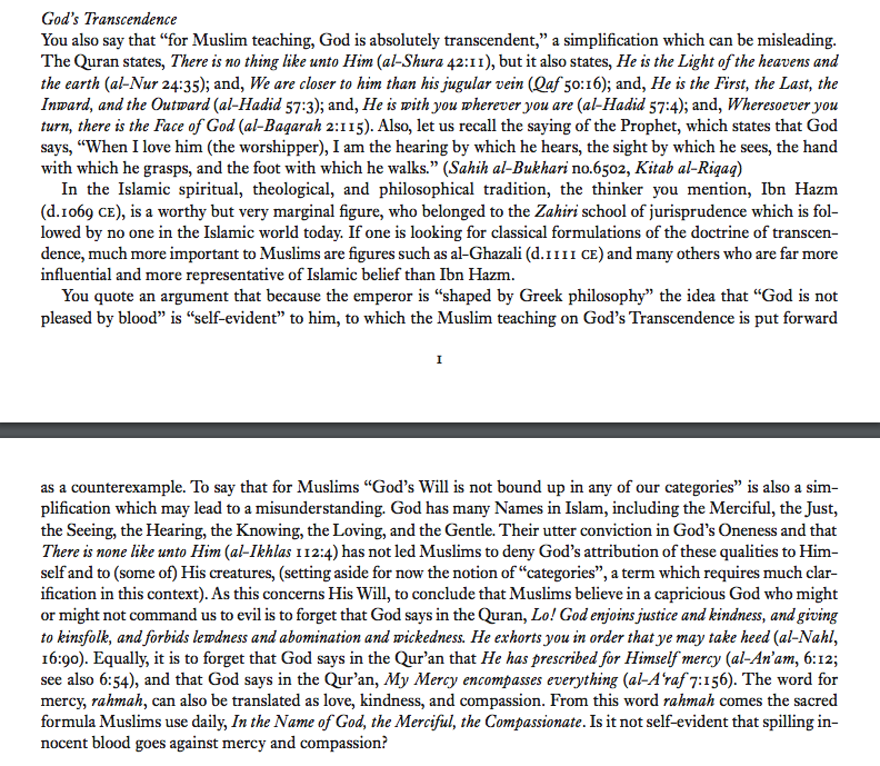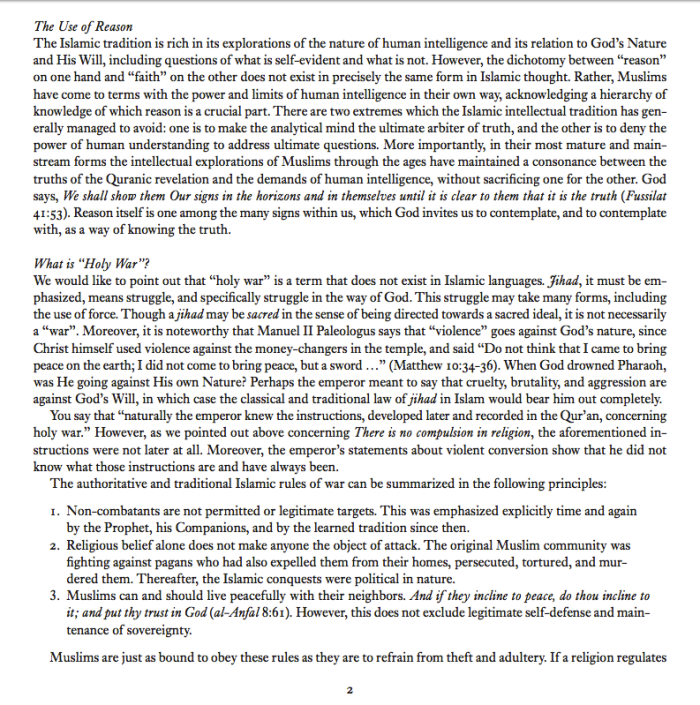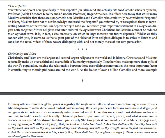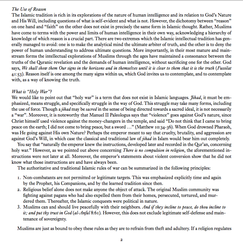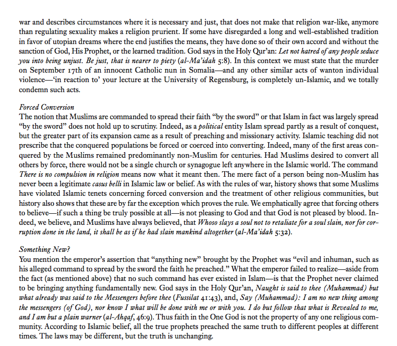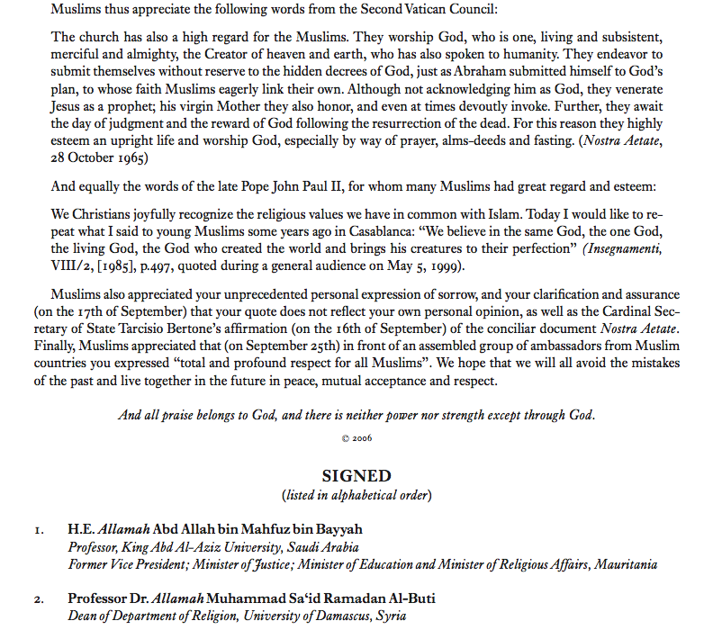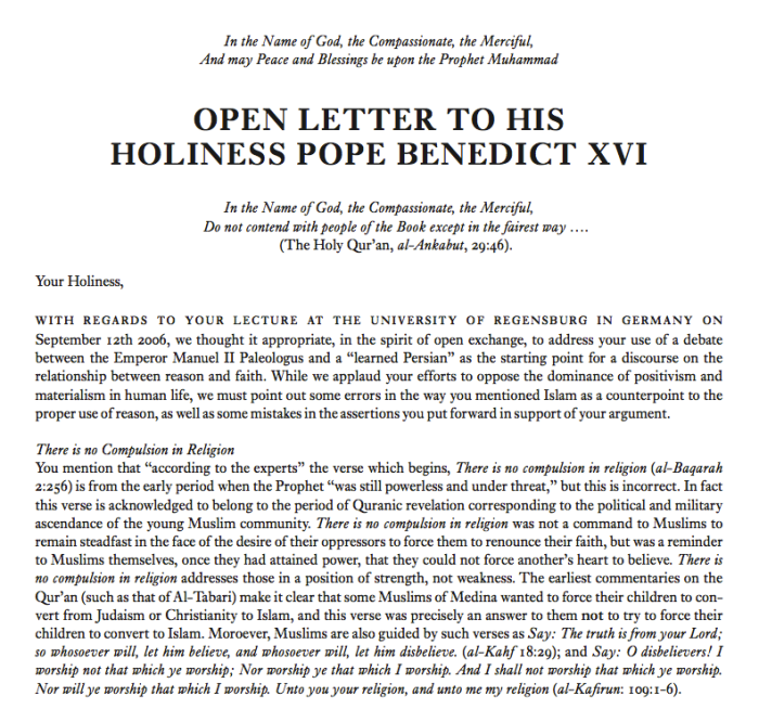 A brilliant and perhaps forgotten Letter to Pope Benedict XVI in 2006 (the predecessor of Pope Francis) from many leading Islamic scholars challenges some Catholic misconceptions about Islam and forced conversion and so-called “Holy War”. It is perhaps worth looking at again for its wisdom, moderation and impeccable scholarship. Enjoy: