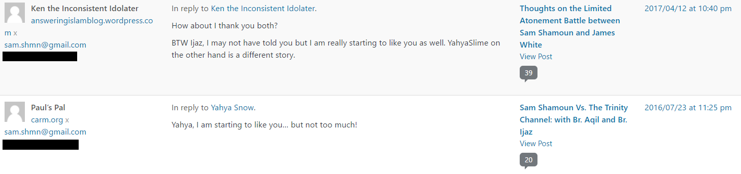 Sam then called me a bunch of names, but this isn’t unusual, from time to time he likes to remind us of how much he likes myself and Br. Yahya, right here on Blogging Theology: