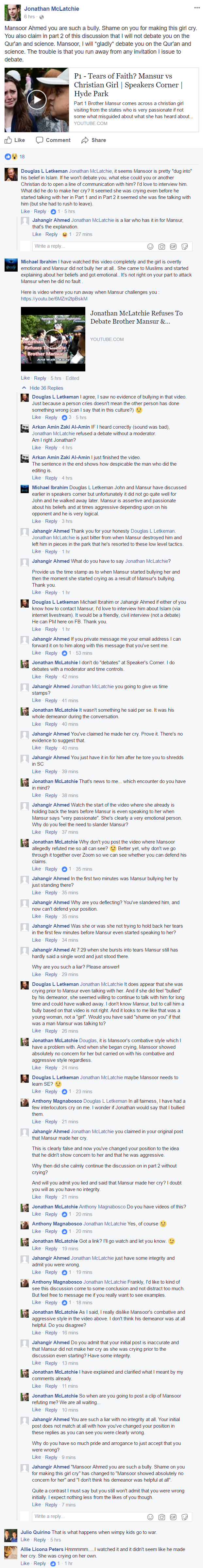 Jonathan McLatchie’s antagonistic and reprehensible behaviour is well known in the interfaith community. Renowned for unabashedly attacking those he disagrees with and then deleting the attacks without apology is par the course for Jonny. This was no more on show than on Monday the 18th of September 2017 on Jonathan’s own Facebook profile. Whether due to malice or personal shame from his interactions with Br. Mansur, Jonathan took it upon himself to slander and attack Br. Mansur for allegedly making a Christian interlocutor cry at Speaker’s Corner. The problem being that the woman was crying when Br. Mansur entered the discussion and sought to calm her down, to the point where she then engaged with Br. Mansur in a beneficial and well received discussion about Islam and Christianity. This however, is not what McLatchie saw. I have saved the discussion, due to expecting Jonny to delete it and then pretending that it never happened having been called out on his blatant slander and dishonesty by Muslims and Christians alike: