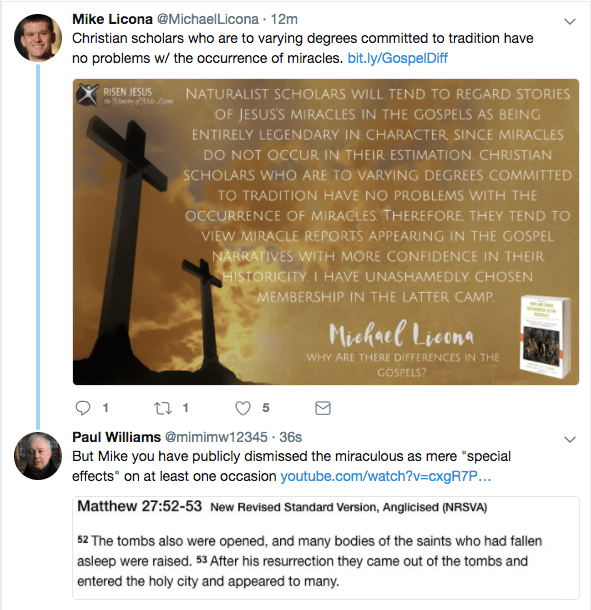 Christian apologist and NT scholar Mike Licona likes to think of himself as a traditional orthodox Christian scholar as we can see in his tweet just published. He boasts that he is unashamedly in the miraculous camp. But this is all vain boasting. For Licona is on record as denying the miraculous nature of the most supernatural event in the gospels, the zombie apocalypse of Matthew 27:52-53: