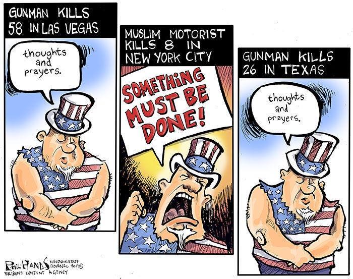 2. There were literally 378 mass shootings in the US in 2017[1] – only times they’re used to push some policy is when a Muslim does it.