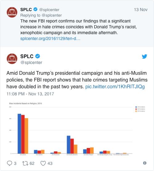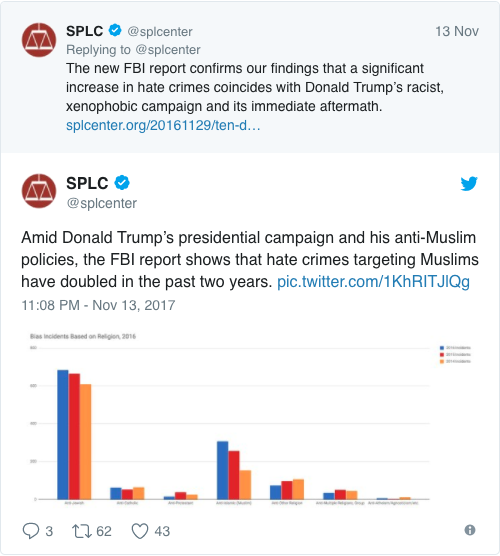 “The significant increase [in hate crimes] over the last two years coincides with Donald Trump’s racist, xenophobic campaign and its immediate aftermath. We reported a surge in hate crimes and other bias-related incidents—many of them carried out in Trump’s name—in the days after the election,” the Southern Poverty Law Center said in a statement.
