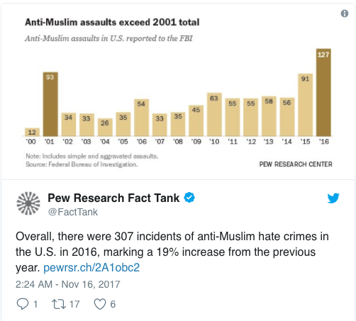 “Overall, there were 307 incidents of anti-Muslim hate crimes in 2016, marking a 19 percent increase from the previous year,” the study reads. “This rise in hate crimes builds on an even sharper increase the year before, when the total number of anti-Muslim incidents rose 67 percent, from 154 in 2014 to 257 in 2015.”