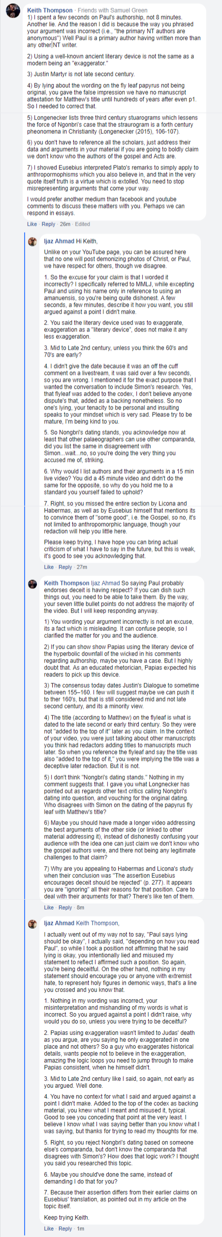 5. He appealed to p75 being 2nd century, I could’ve pointed him to Brent Nongbri’s paper dating it into the 3rd and 4th century CE. The point being, p75 isn’t 1st century, so it aids my point as a later development for the Title for the Gospel of Matthew. He did ask me on Facebook if there was anyone who disagreed with Simon Gathercole’s dating of p4, it is strange because I assumed he had atleast read up on the topic, instead he came to me after the fact to help him support his claims in his video. Odd behaviour.
