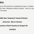 A mouth-watering new post on Professor Bart Ehrman’s webpage. I wish I was doing this course 😦 Course Description This class focuses on one of the foundational disciplines of biblical studies. New Testament textual criticism has experienced a significant resurgence… Read More ›
